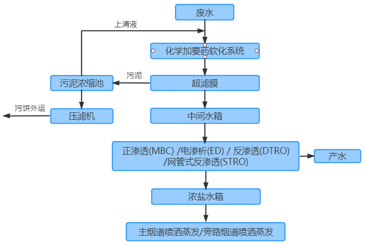 废水经过预处理除去重金属、钙镁等结垢离子,经过膜法浓缩减量后进入烟道喷洒蒸发。预处理和膜浓缩系统与上述第一种工艺相似,不同的是,根据浓缩液后处理选择的方式不同,系统不产生结晶盐,无需加纳滤进行分盐。