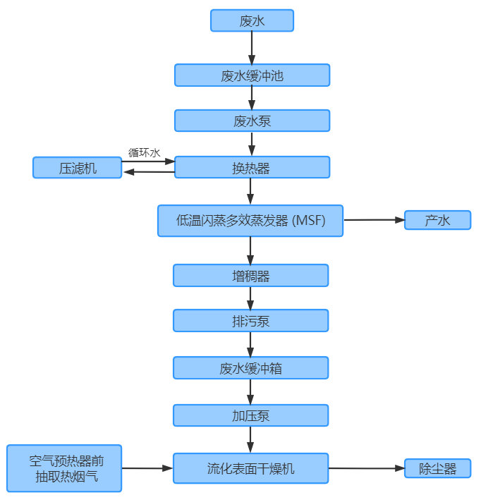 废水不需预处理系统,直接利用低温烟气的热量对废水进行预热,而后经过多效闪蒸浓缩,浓缩物浓度可在线自动可调,浓缩后的浓液进入流化表面干燥机蒸发干燥,产生的粉尘及水蒸气随烟气引入电除尘前烟道,利用电除尘捕捉氯离子和其他固态颗粒及金属元素,蒸发的水蒸汽进入脱硫塔。闪蒸浓缩过程中产生水蒸汽,经过凝结后可回收至脱硫工艺水或其它用途补水。