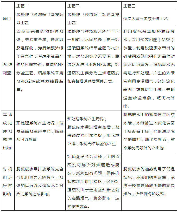 比较上述不同废水零排放工艺,从各工艺的系统配置,优缺点以及对热力系统的影响等方面进行说明。如下表所示: