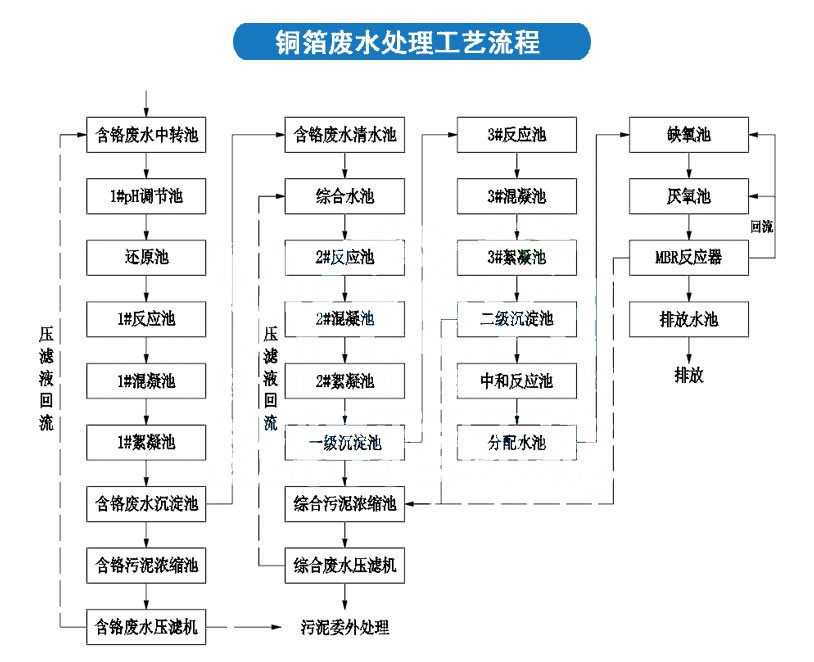 综合废水处理系统采用“多级化学沉淀+厌氧/缺氧+好氧+MBR膜反应”的处理工艺。含铬废水经混凝絮凝沉淀与含铜废水、其他杂排废水分类收集后进入综合水池,经两级反应沉淀、中和反应与生化、MBR反应后,再和多余的纯水制备的浓水一起排入市政管网。