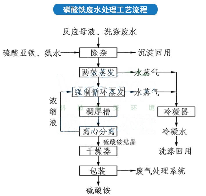 废水加入硫酸亚铁、氨水除杂后进入蒸发系统,沉淀物返回反应釜用于合成磷酸铁。蒸发系统冷凝水作为洗涤用水回用,结晶盐硫酸铵经干燥后作为副产品销售。