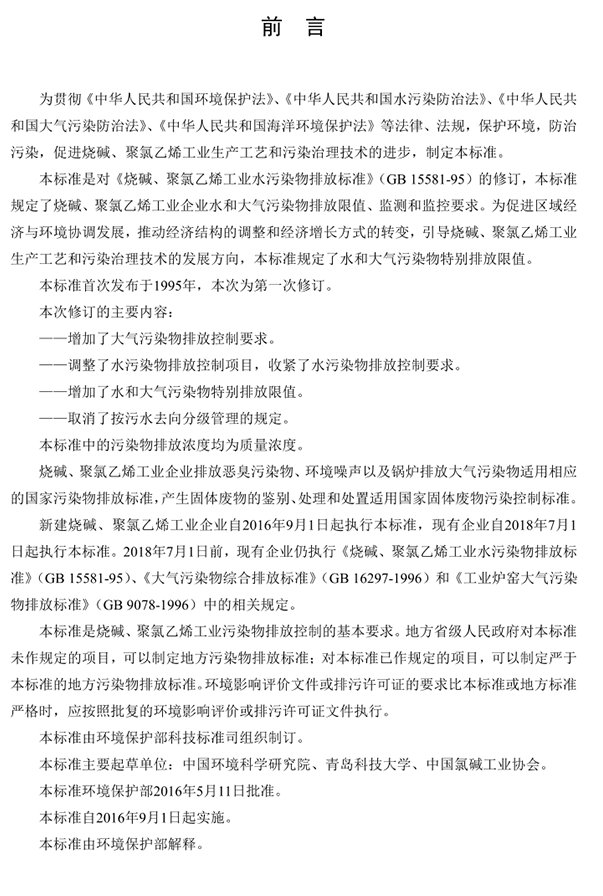 为贯彻《中华人民共和国环境保护法》、《中华人民共和国水污染防治法》、《中华人民共和国大气污染防治法》、《中华人民共和国海洋环境保护法》等法律、法规,保护环境,防治污染,促进烧碱、聚氯乙烯工业生产工艺和污染治理技术的进步,制定本标准。本标准是对《烧碱、聚氯乙烯工业水污染物排放标准》(GB 15581-95)的修订,本标准规定了烧碱、聚氯乙烯工业企业水和大气污染物排放限值、监测和监控要求。为促进区域经济与环境协调发展,推动经济结构的调整和经济增长方式的转变,引导烧碱、聚氯乙烯工业生产工艺和污染治理技术的发展方向,本标准规定了水和大气污染物特别排放限值。