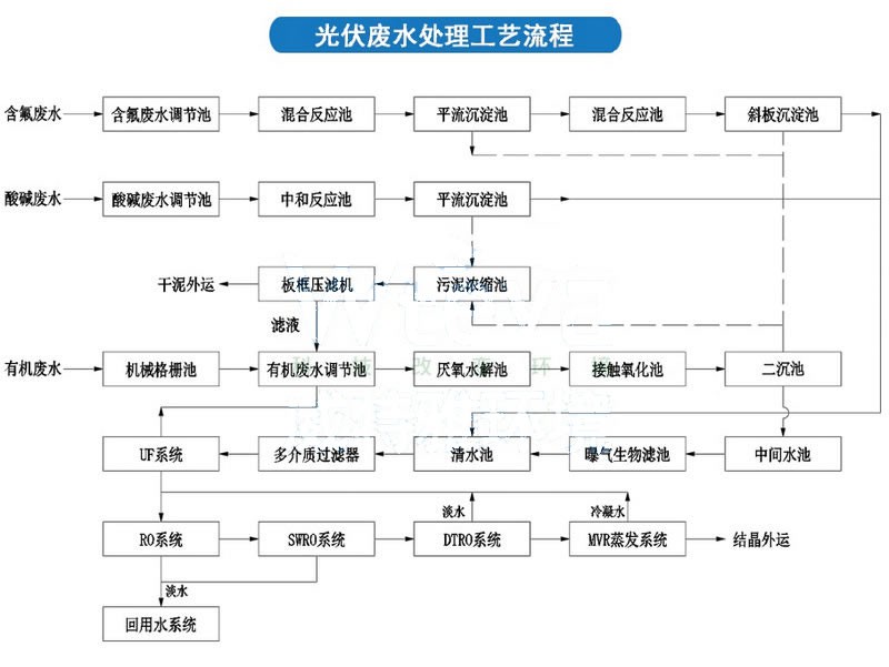 整个光伏产业产生的废水前端处理都集中在硅粉、氢氟酸、COD、高盐上,废水处理过程应当针对不同水质情况进行调节,然后再深度回收处理,该套系统由前端处理+膜处理+蒸发结晶系统组成。