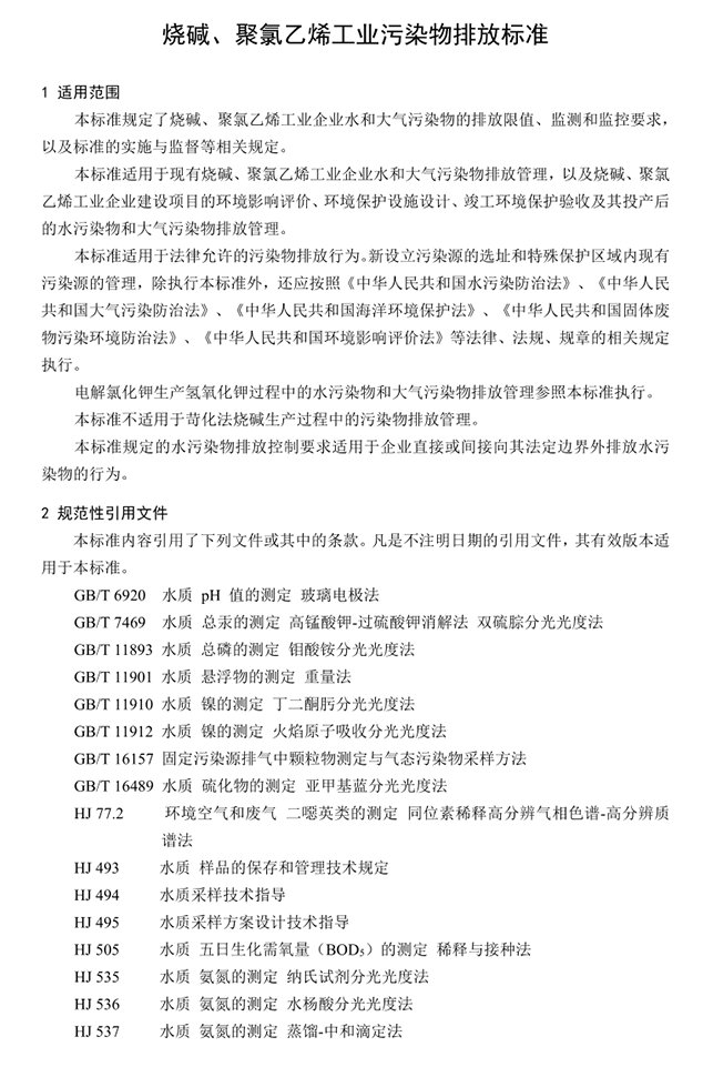 为贯彻《中华人民共和国环境保护法》、《中华人民共和国水污染防治法》、《中华人民共和国大气污染防治法》、《中华人民共和国海洋环境保护法》等法律、法规,保护环境,防治污染,促进烧碱、聚氯乙烯工业生产工艺和污染治理技术的进步,制定本标准。本标准是对《烧碱、聚氯乙烯工业水污染物排放标准》(GB 15581-95)的修订,本标准规定了烧碱、聚氯乙烯工业企业水和大气污染物排放限值、监测和监控要求。为促进区域经济与环境协调发展,推动经济结构的调整和经济增长方式的转变,引导烧碱、聚氯乙烯工业生产工艺和污染治理技术的发展方向,本标准规定了水和大气污染物特别排放限值。