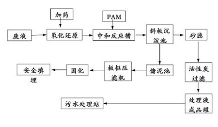 生产废水 → 综合废水收集池 → 一级中和池 → 氧化池 → 软化处理中和池 → 浓密池 → 压滤机 → 污泥回流处理